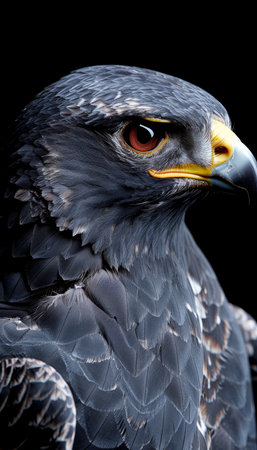 This majestic hawk is perched confidently, its sharp eyes and powerful beak highlighted against a dark background. The detailed feathers and intense expression convey strength and focus..