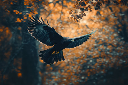 A powerful bird of prey in flight, its wings spread wide against the backdrop of an autumn forest. Documentary photograph. --ar 3:2 --v 6.1 Job ID: ee1d6eac-a857-4d6c-9de0-232ec16e8349