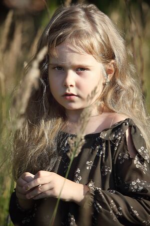 Girl walks in the woods. Girl walking in the park.A little girl of 9 years went for a walk on the street in summer or early autumn. Schoolgirl walking after school. Girl with long hair in a dress