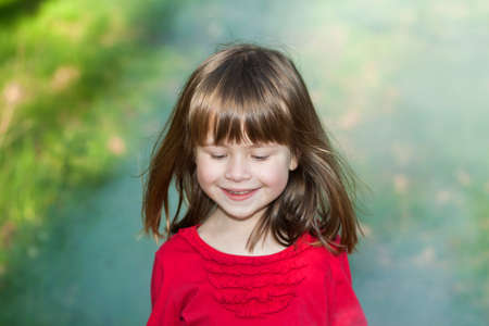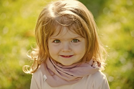 Kids enyoj happy day. Child with adorable face, long hair smile on sunny day