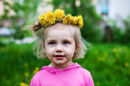 Cute toddler girl outdoors portrait in summer day. Smiling and charming child. Little lady with blonde and curly hair