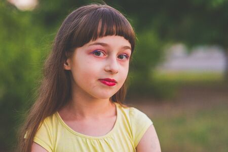 Portrait of a 9 years old female child, portrait concept of a child. Close-up face of beautiful girl 8-9 years old. Concept child teenager. A girl with long blond hair. Girl 9 years old in a cafe