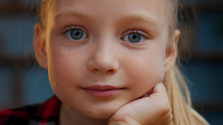 Extreme close up portrait Caucasian little cute child kid girl daughter looking at camera indoors at home look positive charming baby innocence childhood pediatric health childcare happy face emotion