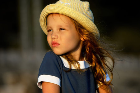 portrait of a beautiful little girl with wavy hair in a straw hat in the bright rays of the setting sun
