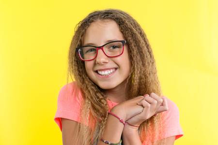 A teenage girl with glasses looks at camera and smiling, yellow studio background