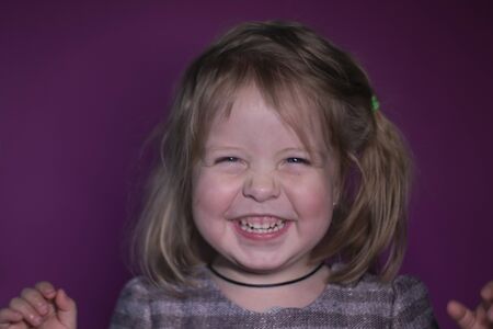 emotional portrait of happy a three year old blond girl with blue eyes on a pink background