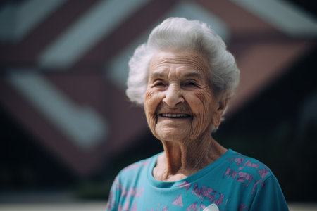 A portrait of an elderly woman with gray hair and glasses, wearing a floral blouse and smiling warmly The background is a vibrant orange This photo captures the beauty and wisdom of age AI Generative