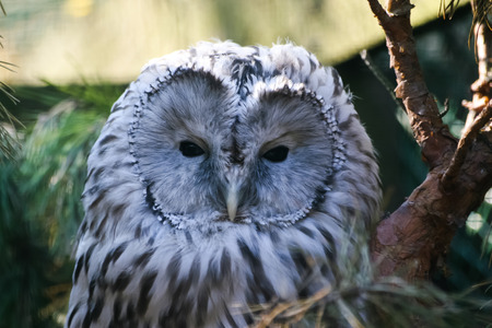 Ural owl resting on a tree branch in mixed forest. Known for its silent flight and deep hooting call, this large owl inhabits European and Asian woodlands.