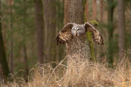 Bird in flight. Great Grey Owl, Strix nebulosa, flying in the forest, blurred autumn trees with first snow in background. Wildlife animal scene from nature. Owl from Sweden autumn forest, first day with snow.