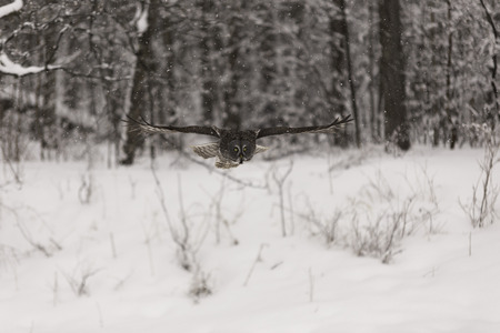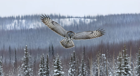 A Majestic Great Grey Owl Soars Over a Snowy Forest