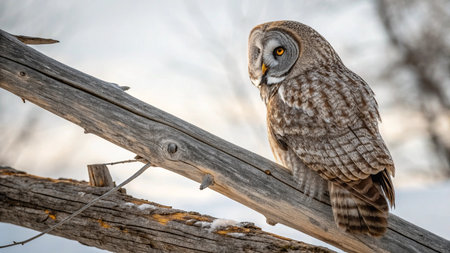 Portrait of great gray owl, strix nebulosa, sitting on trees branch. Very large owl. bird wildlife.