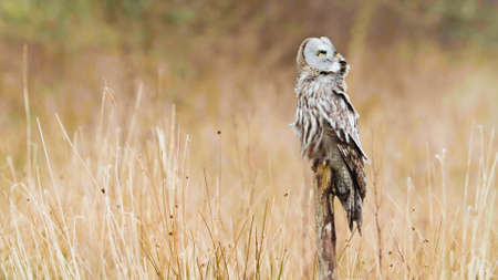 Majestic bird of prey, Great grey owl, Strix nebulosa perched on old birch tree in autumn forest