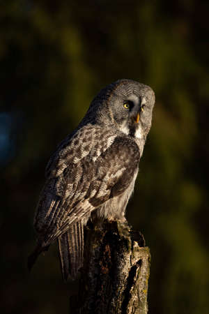 Great Gray Owl Perched on Tree Stump in Forest at Sunset