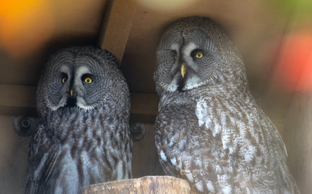 Great grey, gray owls Strix nebulosa, perched and staring facing each other against a clear background
