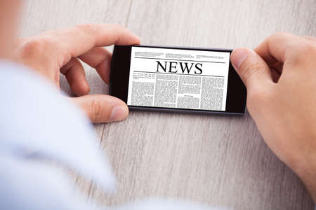 Online news on a smart phone. Businessman reading news or article on a mobile phone screen app. Hand holding smart device. Newspaper and portal on internet. Displayed news are not reality related.