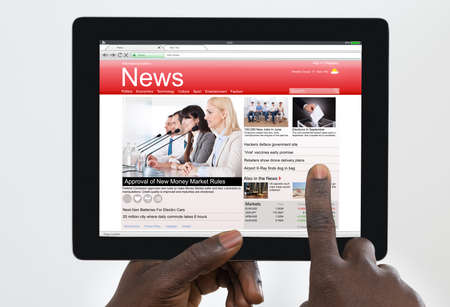 Online news on a smart phone. Close up of businessman reading news or articles in a mobile phone screen app. Hand holding smart device. Mockup website. Newspaper and portal on internet. Displayed news are not reality related