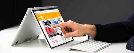 Sample news website opened on laptop's screen. All contents on website are completely made up.