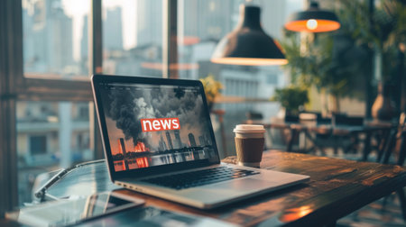 computer monitor with News text displayed Keyboard, mouse, coffee. Concept, sensational news, event, last minute