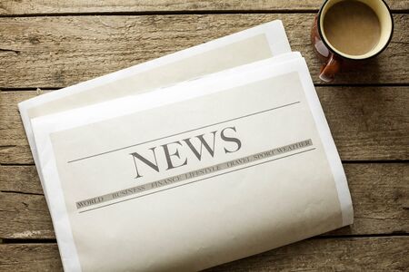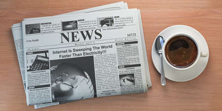 Morning news. Top view of newspaper and coffee cup on wooden table. 3d illustration