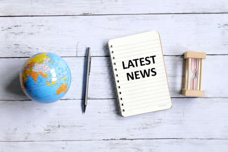 Top view of globe of world map,hour glass,pen and notebook written with 'LATEST NEWS' on white wooden background.