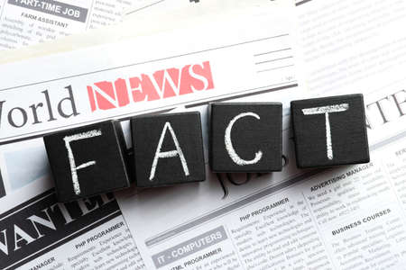 Word FACT made with black cubes on pile of newspapers, flat lay