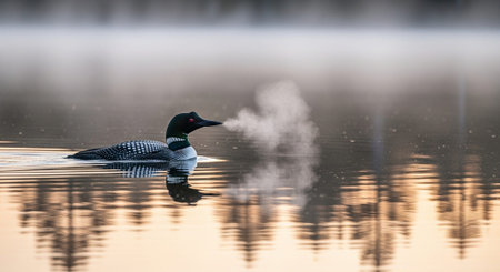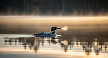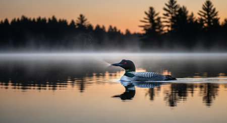 Loon bird floating on a misty lake at dawn