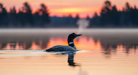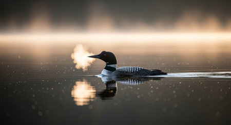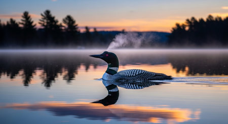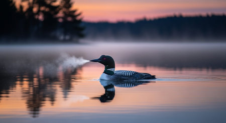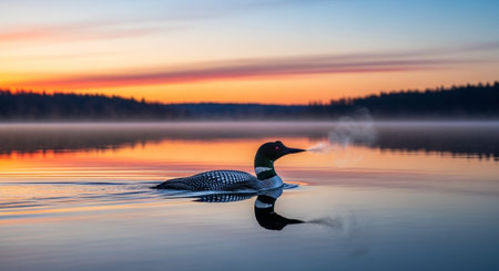 A common loon on a lake at sunrise