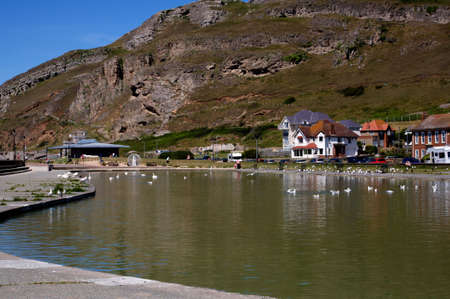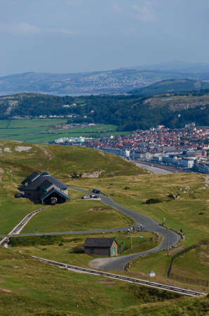 Llandudno, UK: Aug 27, 2019: A scenic view from the Great Orme overlooking the Victorian Tram Halfway station. The seaside town of Llandudno is in the background.