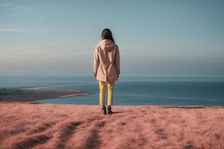 A sculpture of a woman on a rock, gazing out over the vast ocean in a serene natural landscape, with the sky and water blending seamlessly AIG50