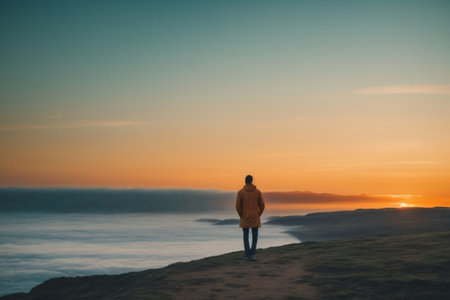 a sheep peacefully grazes on the lush green grasses of a distant field, resembling the majestic and sweeping seascapes found in lively coastal landscapes. the backlit photography captures the scene beautifully, with the vibrant green and gold hues creating horizontal stripes across the image. this stunning 3840x2160 resolution photo showcases the sheep against a spectacular backdrop. ai generated