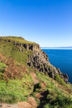 The rugged coastline of the Isle of Skye with a clear blue sky overhead