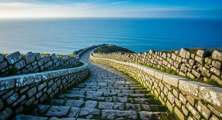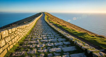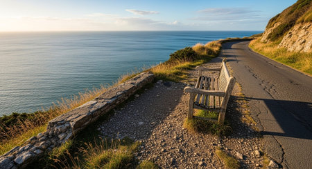 A peaceful pathway meanders along the cliffs overlooking a calm ocean, showcasing the beauty of nature with golden grass swaying in the sunlight.