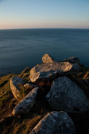 A pile of rocks on the coast in the red evening light and a view of the sea beyond.