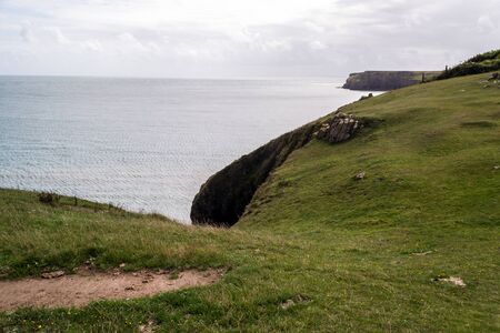 View of the rugged coast and coastal path near the Valley of Rocks, in north Devon. Beautiful if bleak in bad weather. June 2021.
