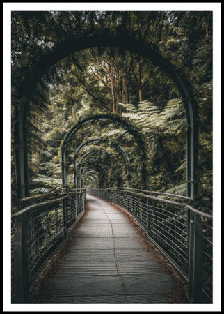 A pathway stretches through arched structures surrounded by dense foliage. The image displays a linear composition, with a wooden path leading into the distance. Lush greenery and natural light contribute to a peaceful atmosphere. Ideal for editorial use, nature features, and environmental themes.
