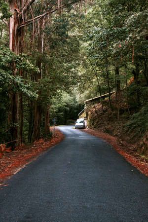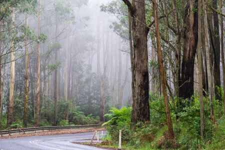 Driving through mist and forest on popular tourist route of Great Ocean Road in Victoria Australia.