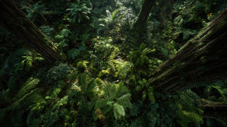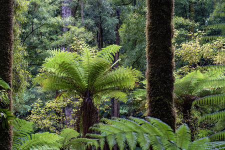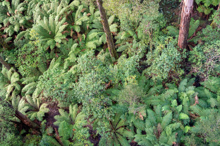 Vibrant ferns cover the forest floor in Great Otway National Park, Victoria, Australia. The aerial view highlights the dense, green foliage in this rich natural environment