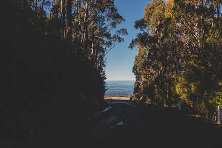 beautiful road surrounded by tall eucalyptus gum tree and Australian bush land while driving up Mount Wellington Kunanyi in Tasmania