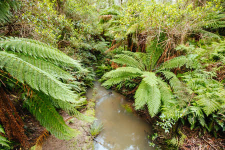 Panorama of river in a rainforest of ancient myrtle beech trees and tree ferns. A bridge is constructed from a fallen tree. Yarra Ranges, Victoria, Australia