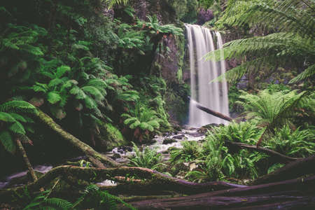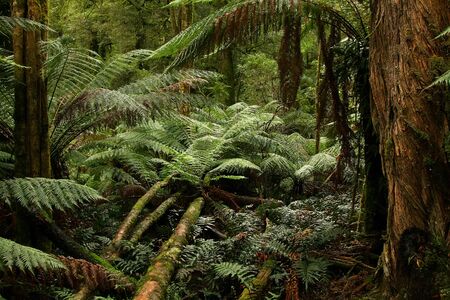 wild bush landscape with lush and thick vegetation in Myrtle Falls in Tasmania, Australia