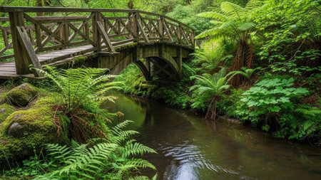 A wooden bridge gracefully winds its way through lush, green fern leaves in a tropical setting.