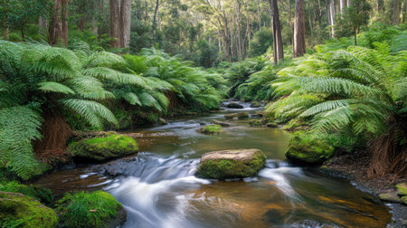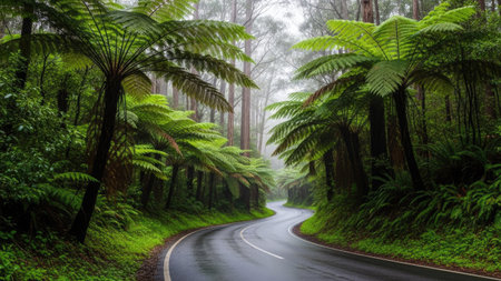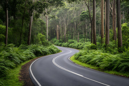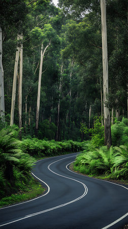 S-curved road vanishing into a dense forest. Towering eucalyptus trees and vibrant green ferns envelop the roadside, creating a scene of natural beauty and tranquil escape.