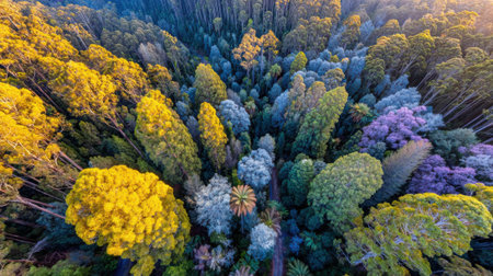 Aerial drone shot of vibrant forest with yellow, green, and purple trees
