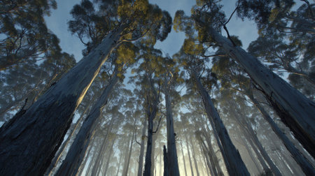 An awe inspiring upward view of a tranquil forest. Tall, straight tree trunks reach towards the twilight sky, creating a powerful and serene natural cathedral.
