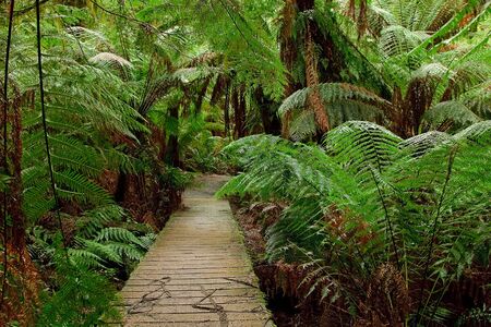 Wooden path with tropical fern in Santa Catarina, Brazil