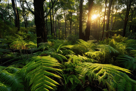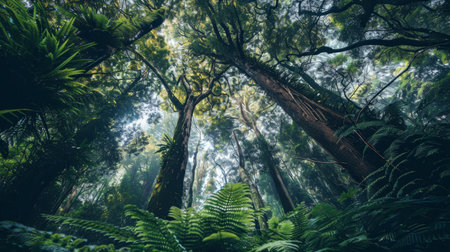 This captivating image showcases a dense forest filled with vibrant greenery and towering trees, illuminated by bright natural light, perfect for nature themes.