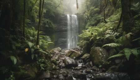 Tranquil scene of flowing water in tropical rainforest with green foliage generated by artificial intelligence