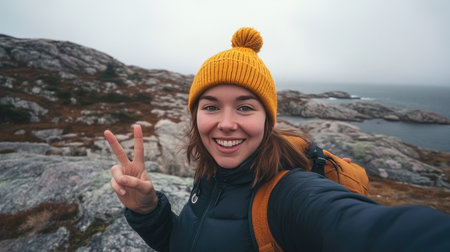Happy hiker with short brunette hair and a yellow beanie takes a selfie with a peace sign, rocky cliffs and dramatic clouds in the background.