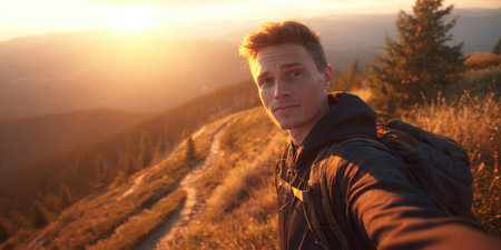 A man with a backpack taking selfie on trail, AI