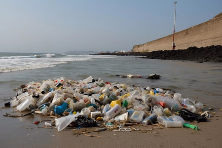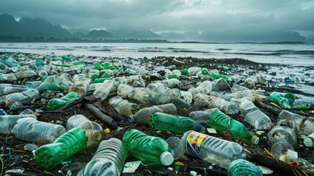 A coastal scene reveals a beach strewn with debris, indicating environmental pollution. The overcast sky and dark tones create a somber atmosphere. Various types of waste are scattered across the sand, illustrating the negative impact on natural environments. This image could be used for editorial and commercial purposes.